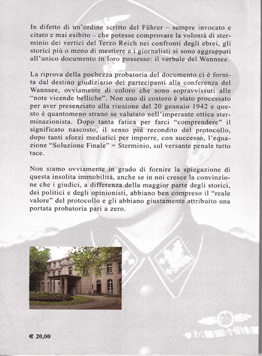 In difetto di un’ordine sritto dal Fuhrer, sempre invocato e citato e mai esistito, che potesse comprovare la volontà di sterminio dei vertici del terzo Reich nei confronti degli ebrei, gli storici più o meno di mestiere e i giornalisti si sono aggrappati all’unico documento in loro possesso:il verbale del Wansee. La riprova della pochezza probatoria del documento ci è fornito dal destino giudiziario dei partecipanti alla conferenza. Non uno di costoro è stato processato a guerra finita per aver presenziato alla riunione del 20 gennauio 1942.
