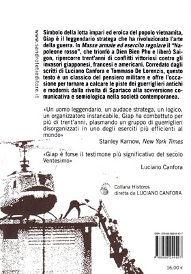 Simbolo della lotta impari ed eroica del popolo vietnamita, Giap è il leggendario stratega che ha rivoluzionato l’arte della guerra. In Masse armate ed esercito regolare il “Napoleone rosso”, che trionfò a Dien Bien Phu e liberò Saigon, ripercorre trent’anni di conflitti vittoriosi contro giapponesi, francesi e americani. Corredato dagli scritti di Luciano Canfora e Tommaso De Lorenzis, questo testo è un classico del pensiero militare e offre l’occasione per tornare a calcare le piste dei guerriglieri antichi e moderni: dalla rivolta di Spartaco alla sovversione comunicativa e semiologica nella società contemporanea.