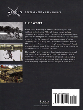 La monografia fa parte di una serie della Osprey publishing incentrata sulle armi portatili per la fanteria: dalle pistole ai fucili d’assalto, dalle mitragliatrici alle armi d’appoggio individuali. Queste armi al loro apparire hanno permesso al semplice soldato di fanteria di poter disporre di un potere di fuoco sempre maggiore, ed hanno in rivoluzionato le tecniche di combattimento, alcune hanno avuto più fortuna di altre e sono rimaste in servizio per interi decenni, altre sono state invece surclassate da nuovi modelli che hanno preso il loro posto dopo pochi anni. Questa pubblicazione si occupa in particolare del Bazooka americano. Ogni volume è illustrato con circa 80 fotografie in b/n e a colori.